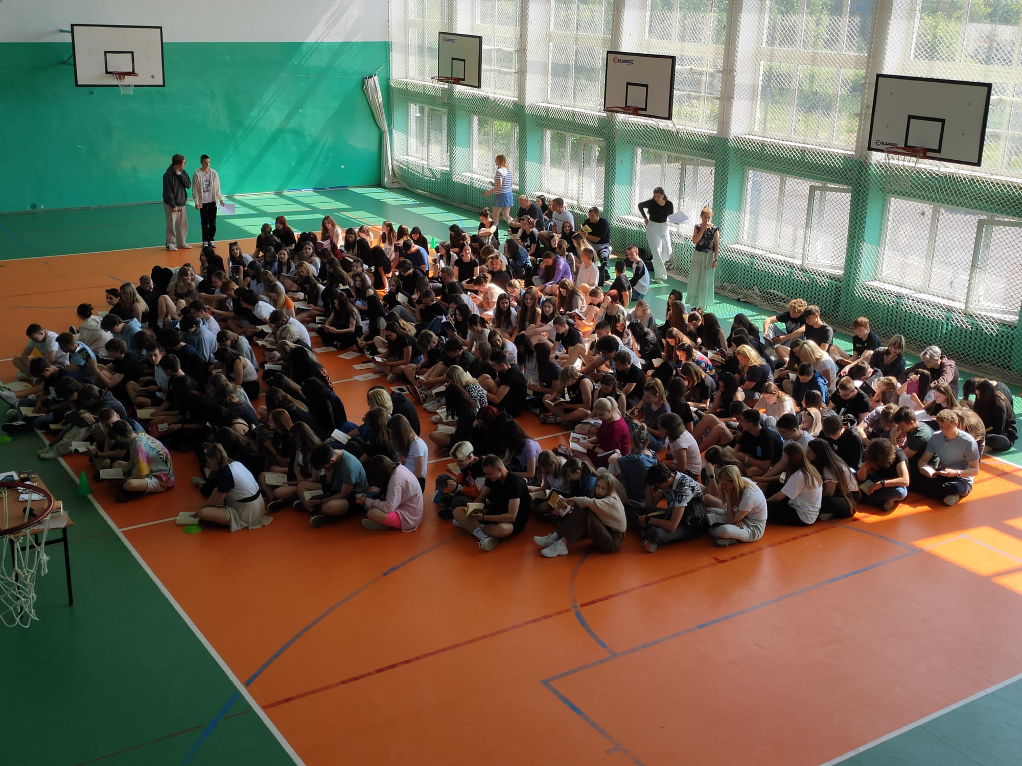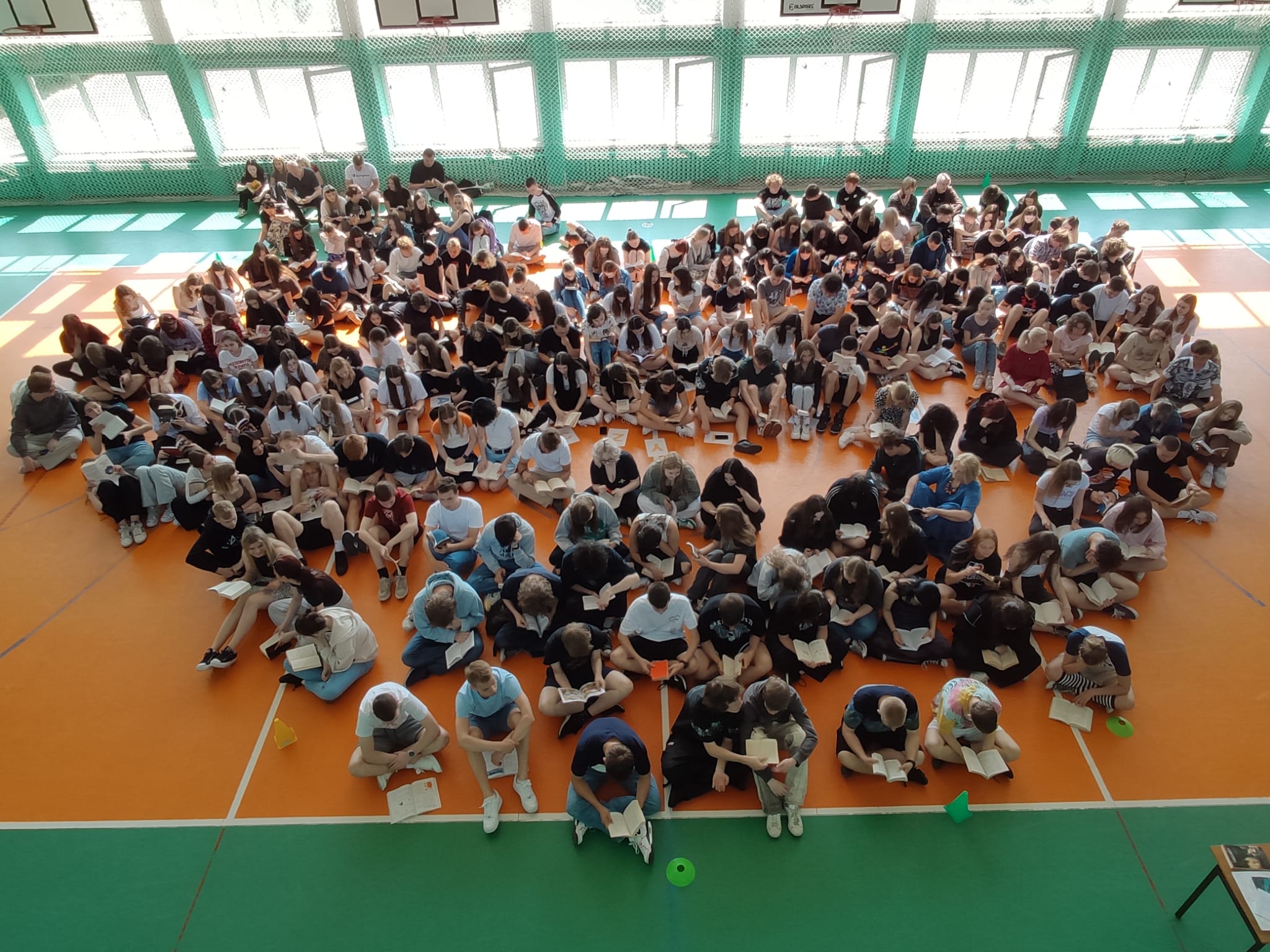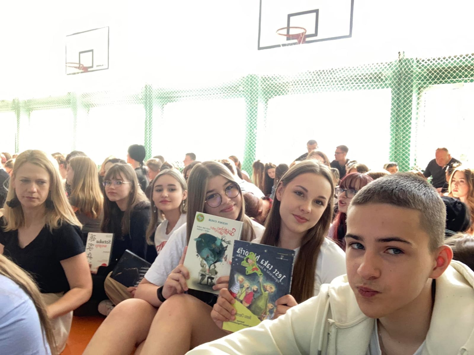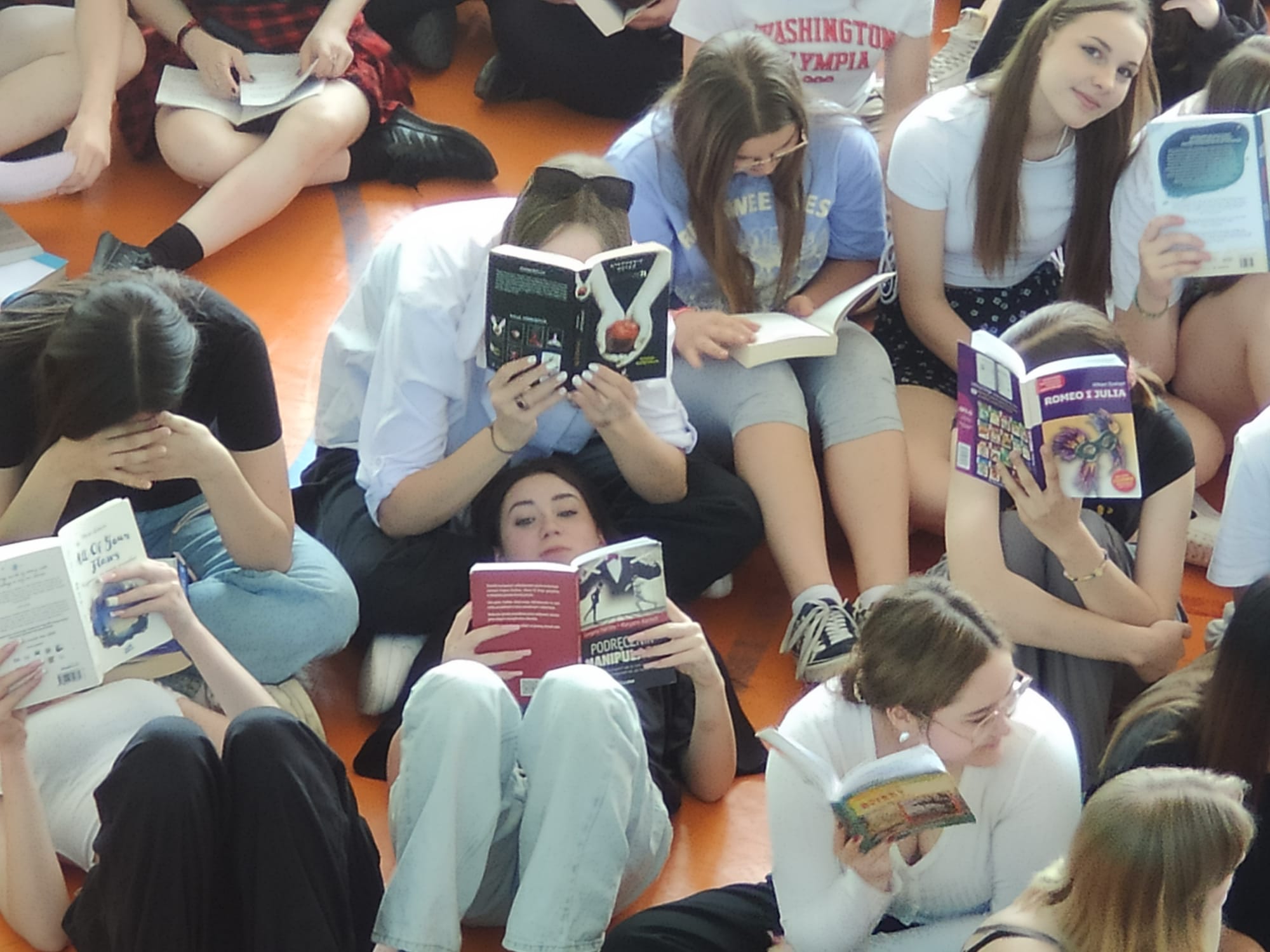 O godz. 9.45 uczniowie i nauczyciele zebrali się na sali gimnastycznej. Przed wejściem na salę, liczono osoby wchodzące z książką w ręku. Udało nam się pobić rekord, z liczbą 228 uczestników akcji. Aby wprowadzić uczniów w atmosferę czytelniczą, pan Krzysztof Leszek, bibliotekarz szkolny, odczytał głośno fragment „Mistrza i Małgorzaty” M. Bułhakowa.