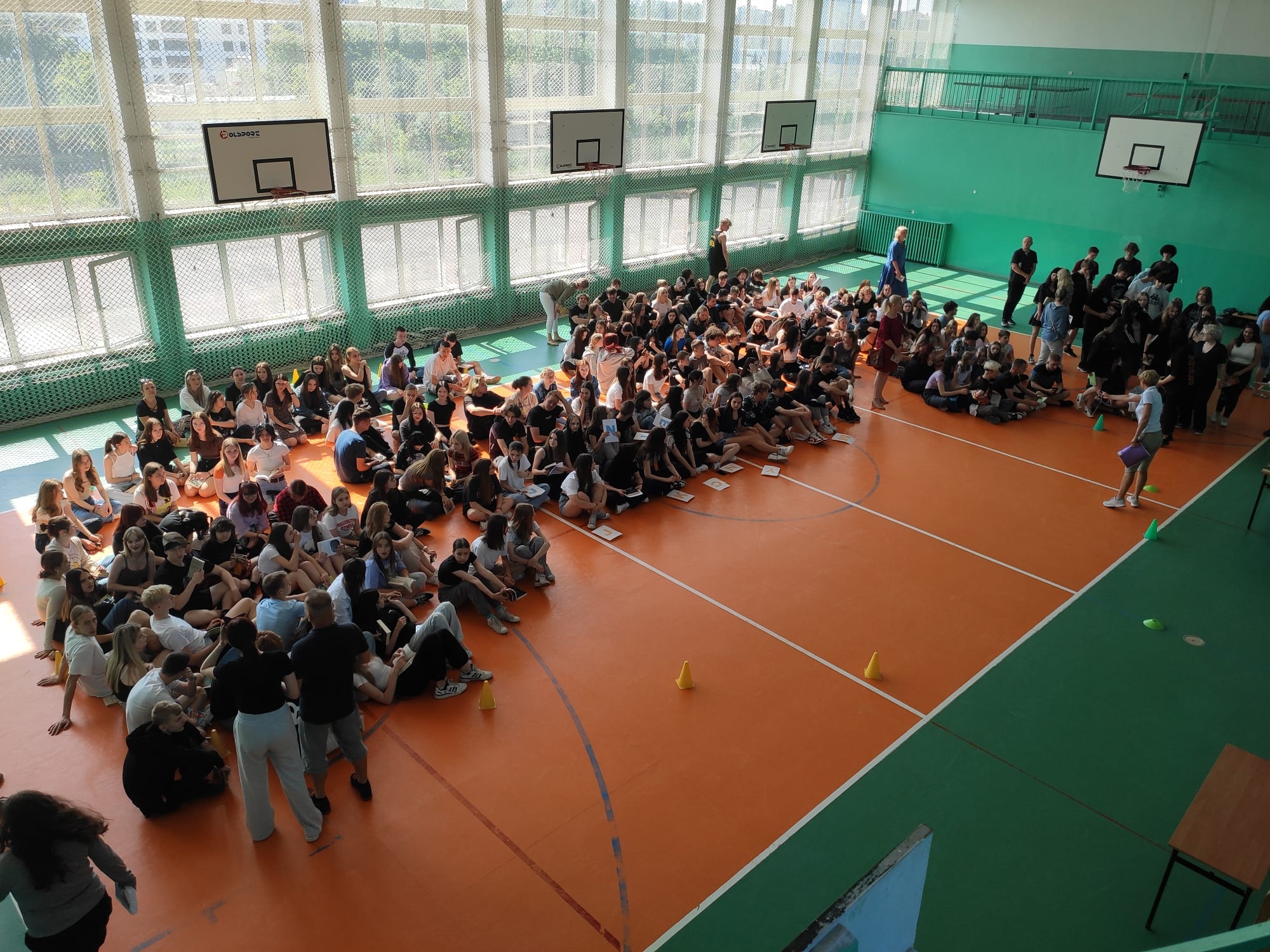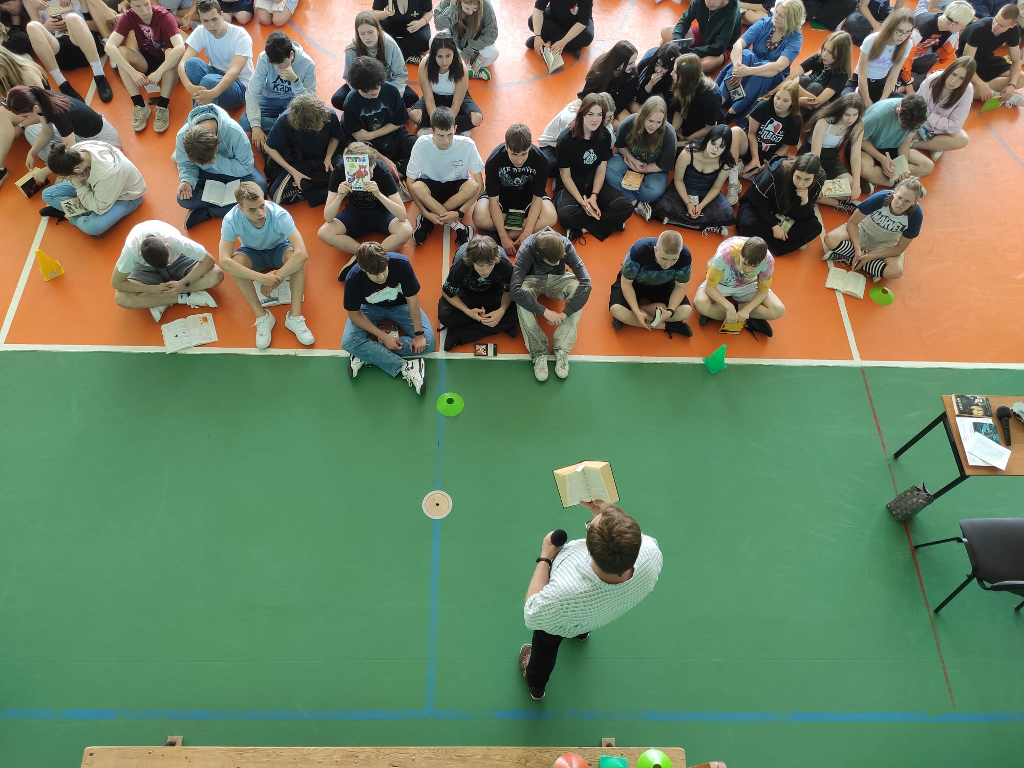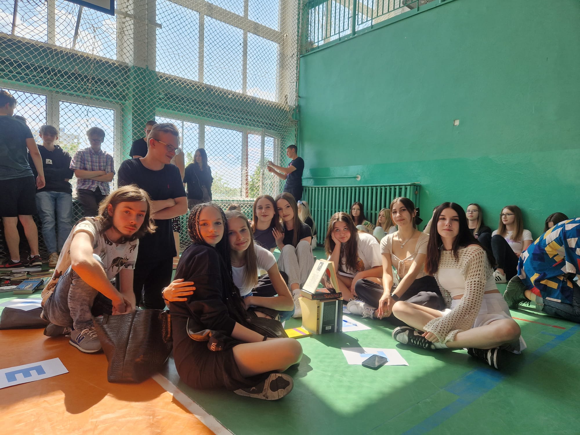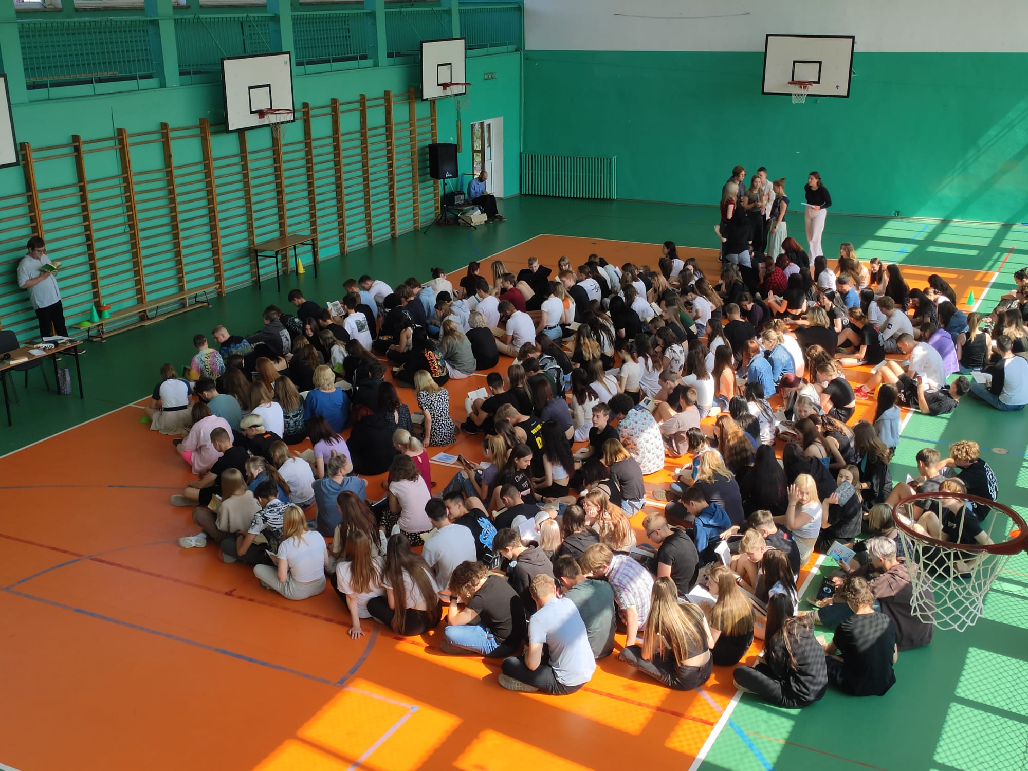 O godz. 9.45 uczniowie i nauczyciele zebrali się na sali gimnastycznej. Przed wejściem na salę, liczono osoby wchodzące z książką w ręku. Udało nam się pobić rekord, z liczbą 228 uczestników akcji. Aby wprowadzić uczniów w atmosferę czytelniczą, pan Krzysztof Leszek, bibliotekarz szkolny, odczytał głośno fragment „Mistrza i Małgorzaty” M. Bułhakowa.