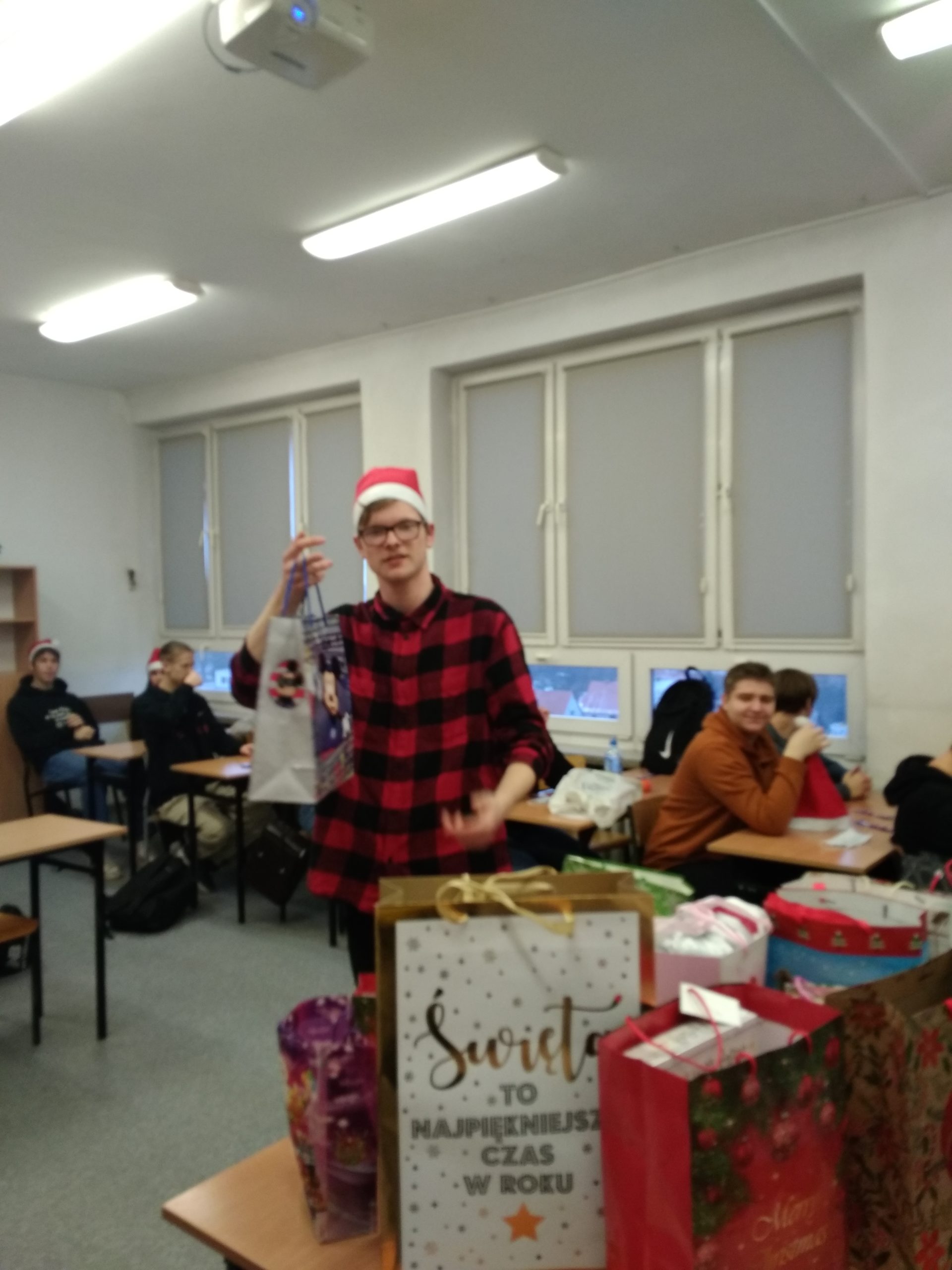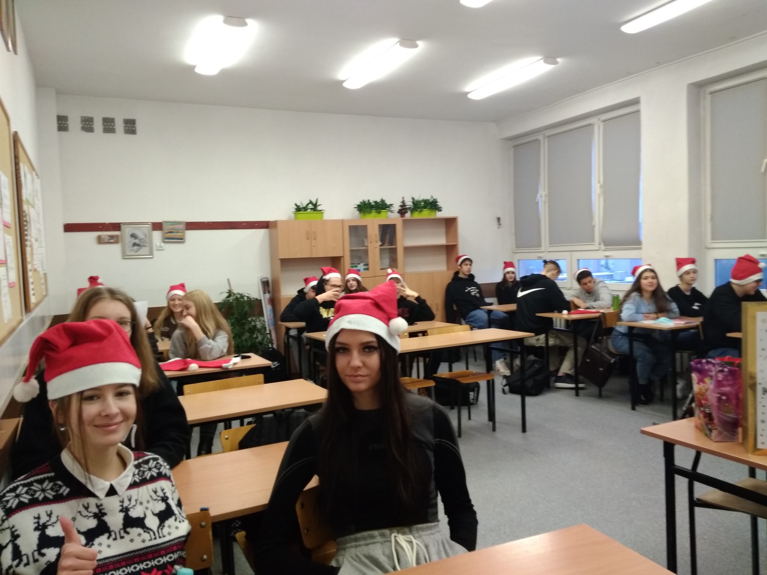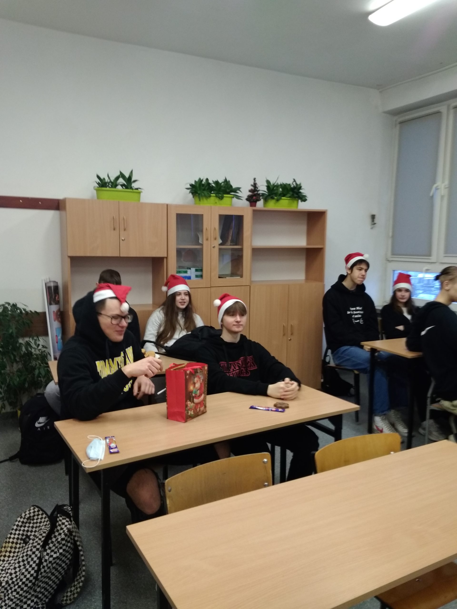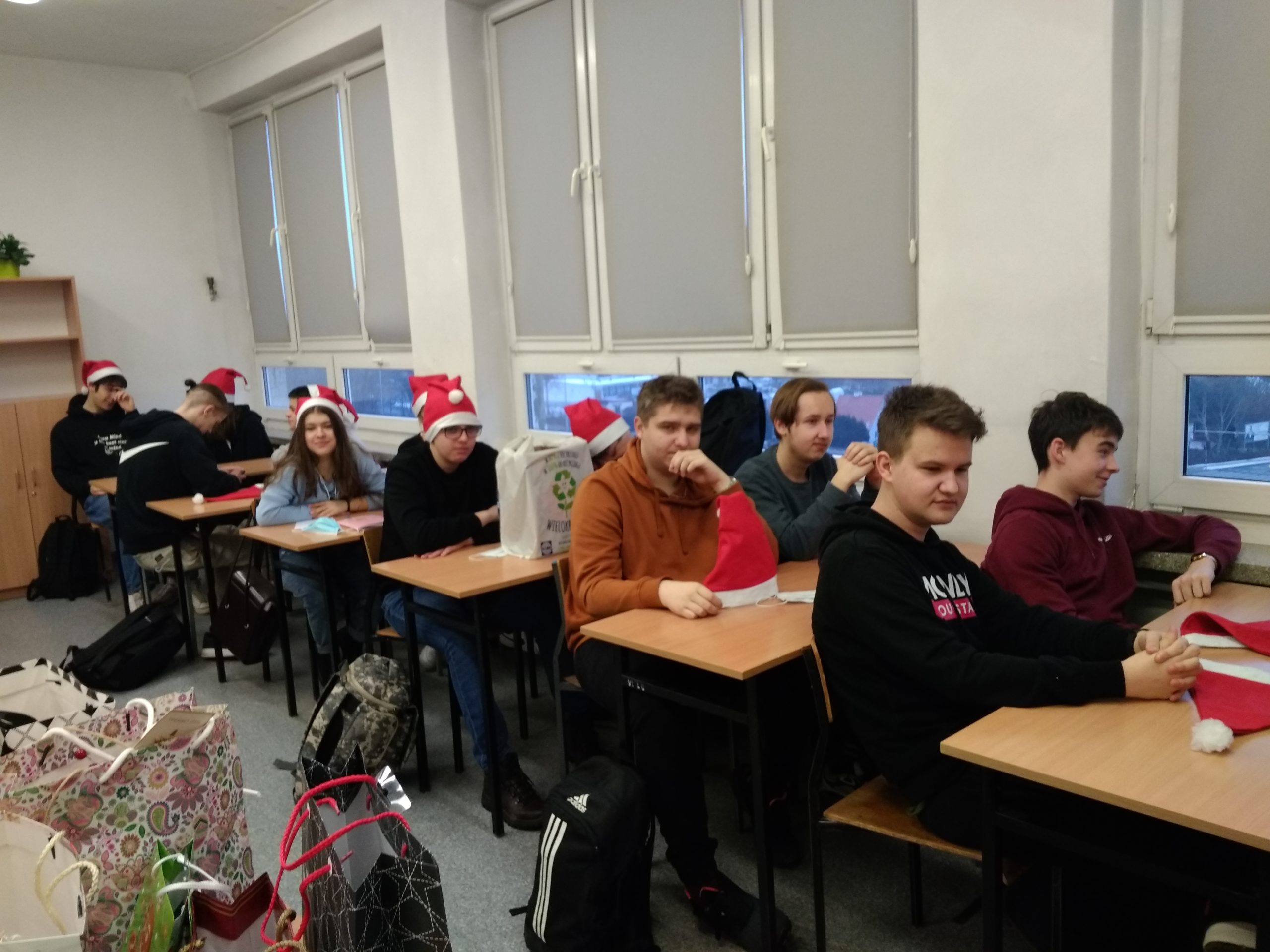 W poniedziałek 13 grudnia klasa IIA wraz z wychowawcą – p. K. Dubicką zorganizowała klasowe Mikołajki. W tym roku trochę spóźnione z powodu kwarantanny… Na godzinie wychowawczej obdarowywaliśmy się prezentami, składaliśmy sobie świąteczna życzenia i zajadaliśmy się słodkimi piernikami. W roli Mikołaja wystąpił Bartłomiej Rolnik. Tak bardzo przejął się swoją rolą, że zapomniał, kto jest kim:) Oczywiście, wszystko można wybaczyć – jak tu integrować się z klasą i zapamiętać tyle nazwisk, gdy pandemia „rzuca” nas co chwilę przed ekrany komputerów???