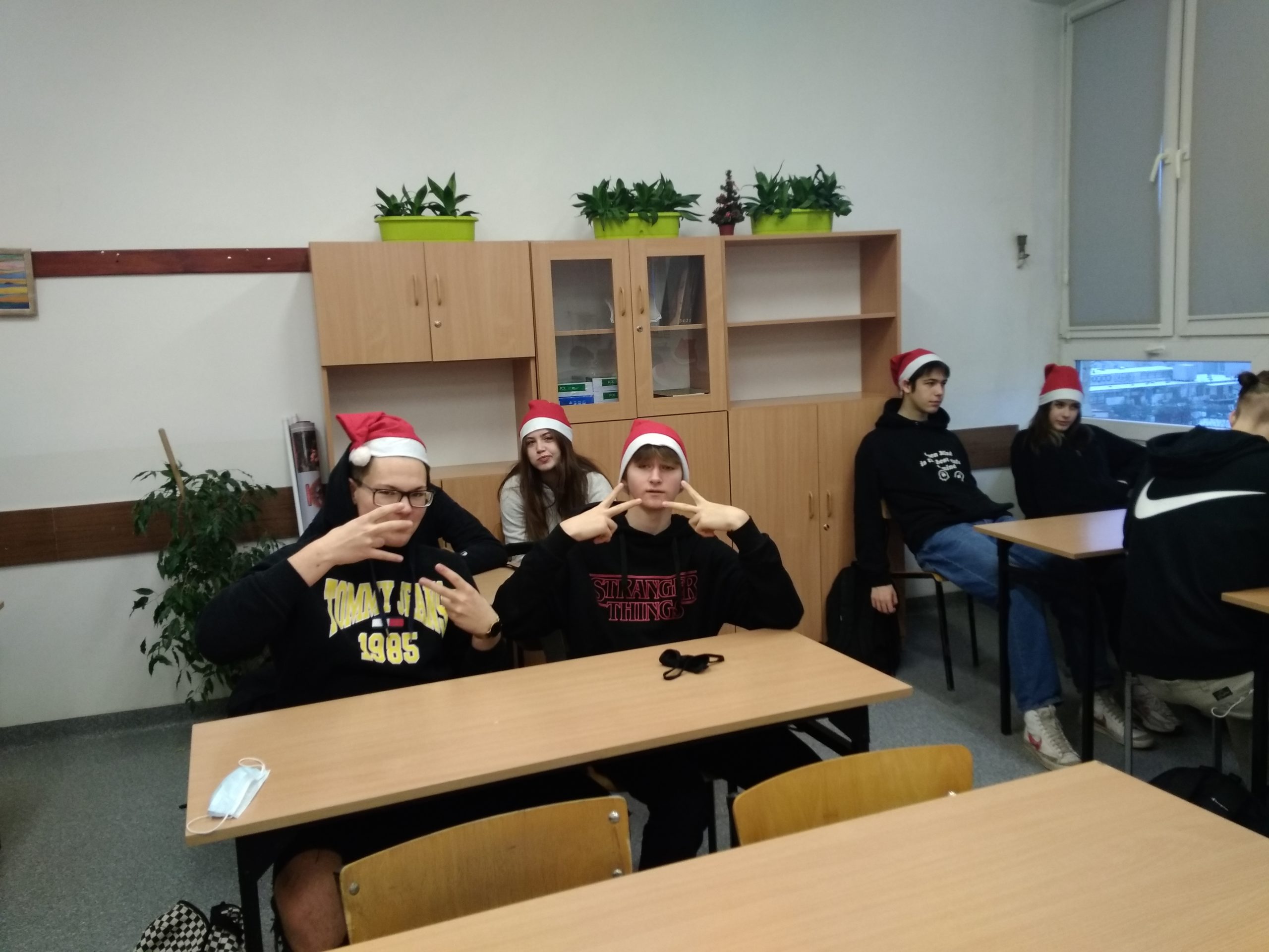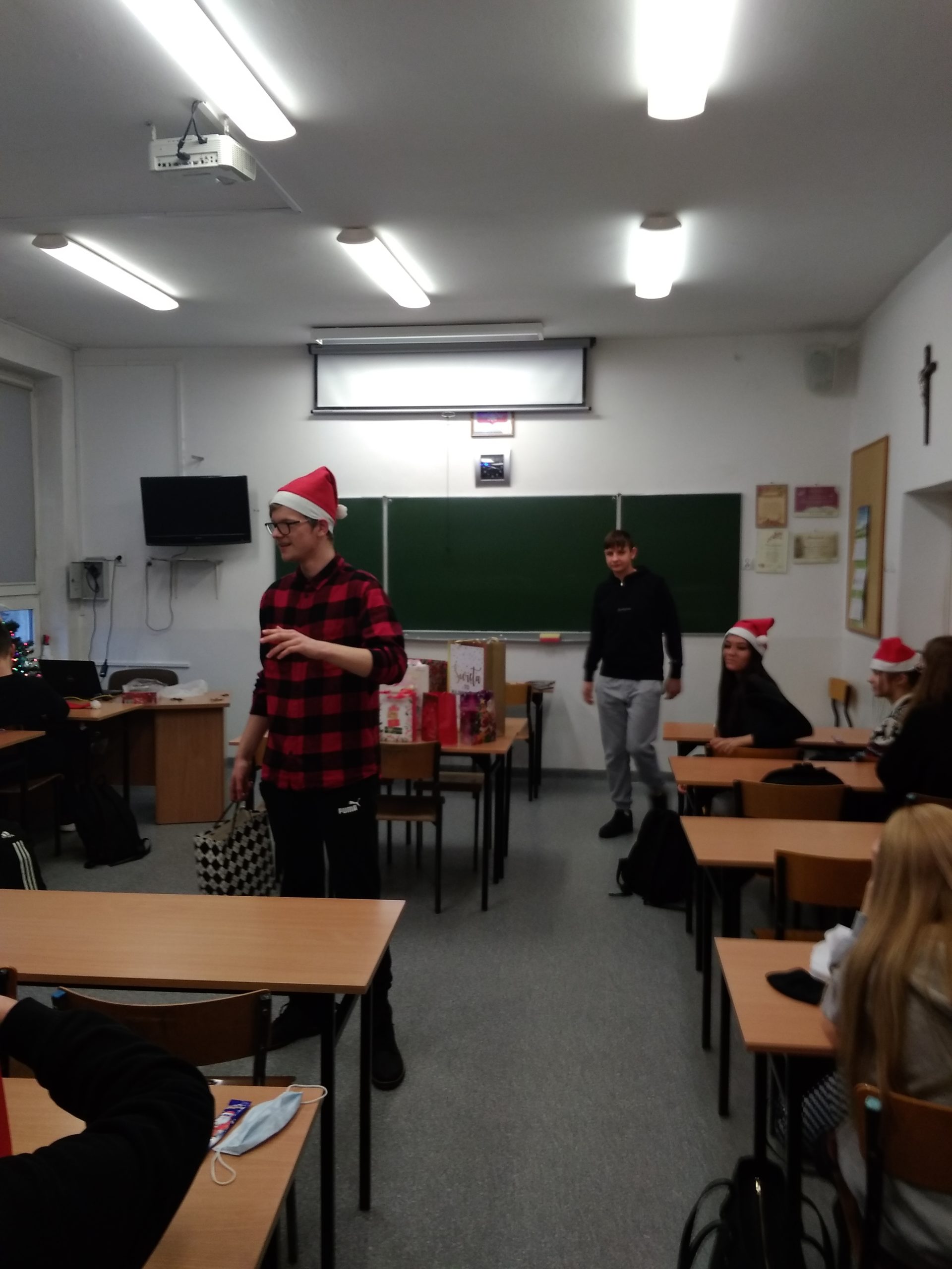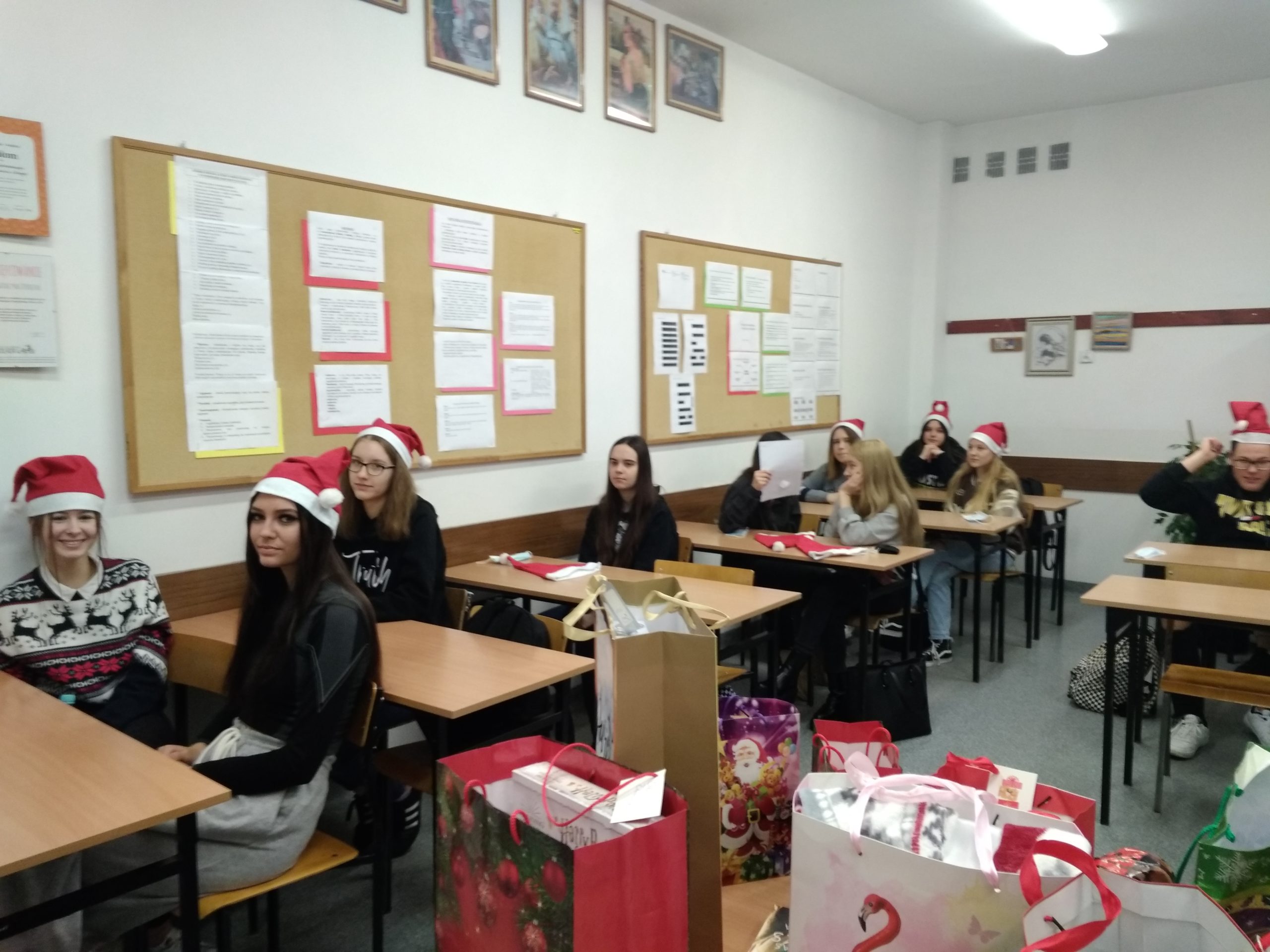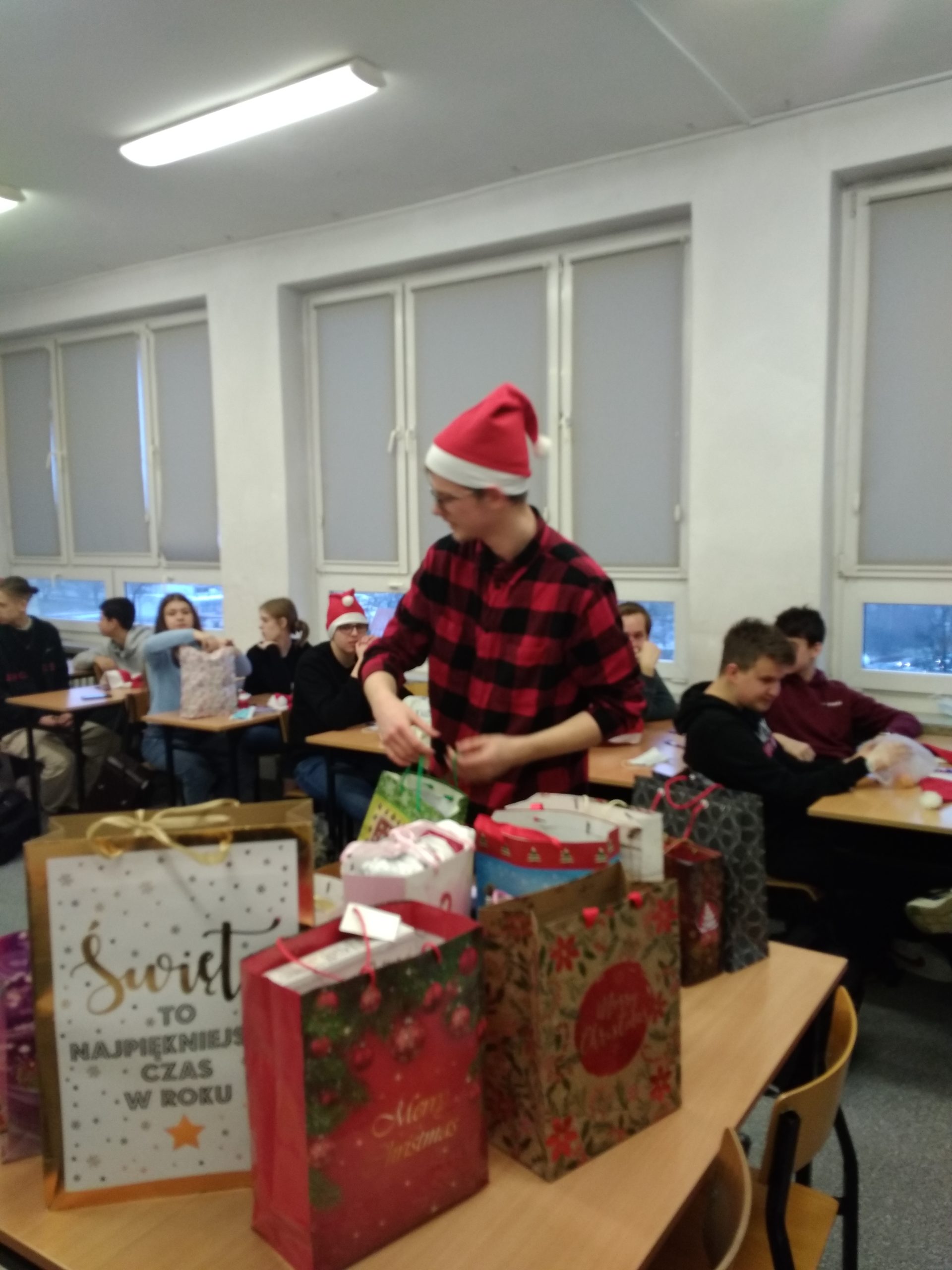 W poniedziałek 13 grudnia klasa IIA wraz z wychowawcą – p. K. Dubicką zorganizowała klasowe Mikołajki. W tym roku trochę spóźnione z powodu kwarantanny… Na godzinie wychowawczej obdarowywaliśmy się prezentami, składaliśmy sobie świąteczna życzenia i zajadaliśmy się słodkimi piernikami. W roli Mikołaja wystąpił Bartłomiej Rolnik. Tak bardzo przejął się swoją rolą, że zapomniał, kto jest kim:) Oczywiście, wszystko można wybaczyć – jak tu integrować się z klasą i zapamiętać tyle nazwisk, gdy pandemia „rzuca” nas co chwilę przed ekrany komputerów???