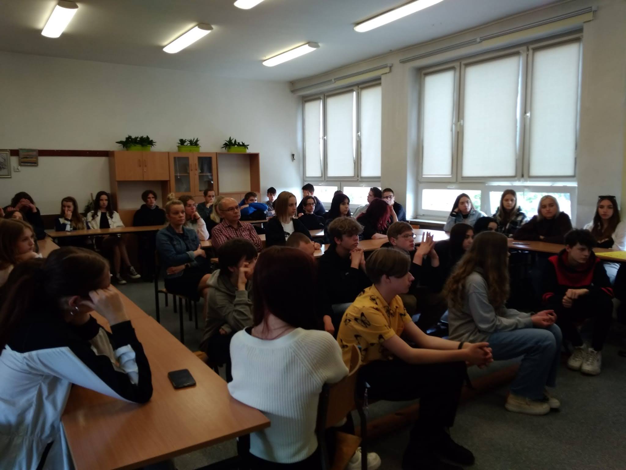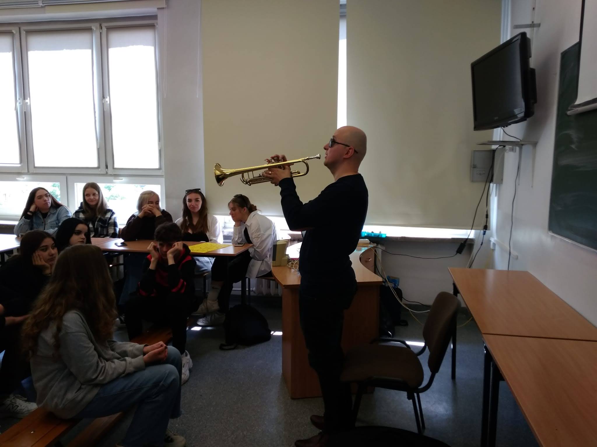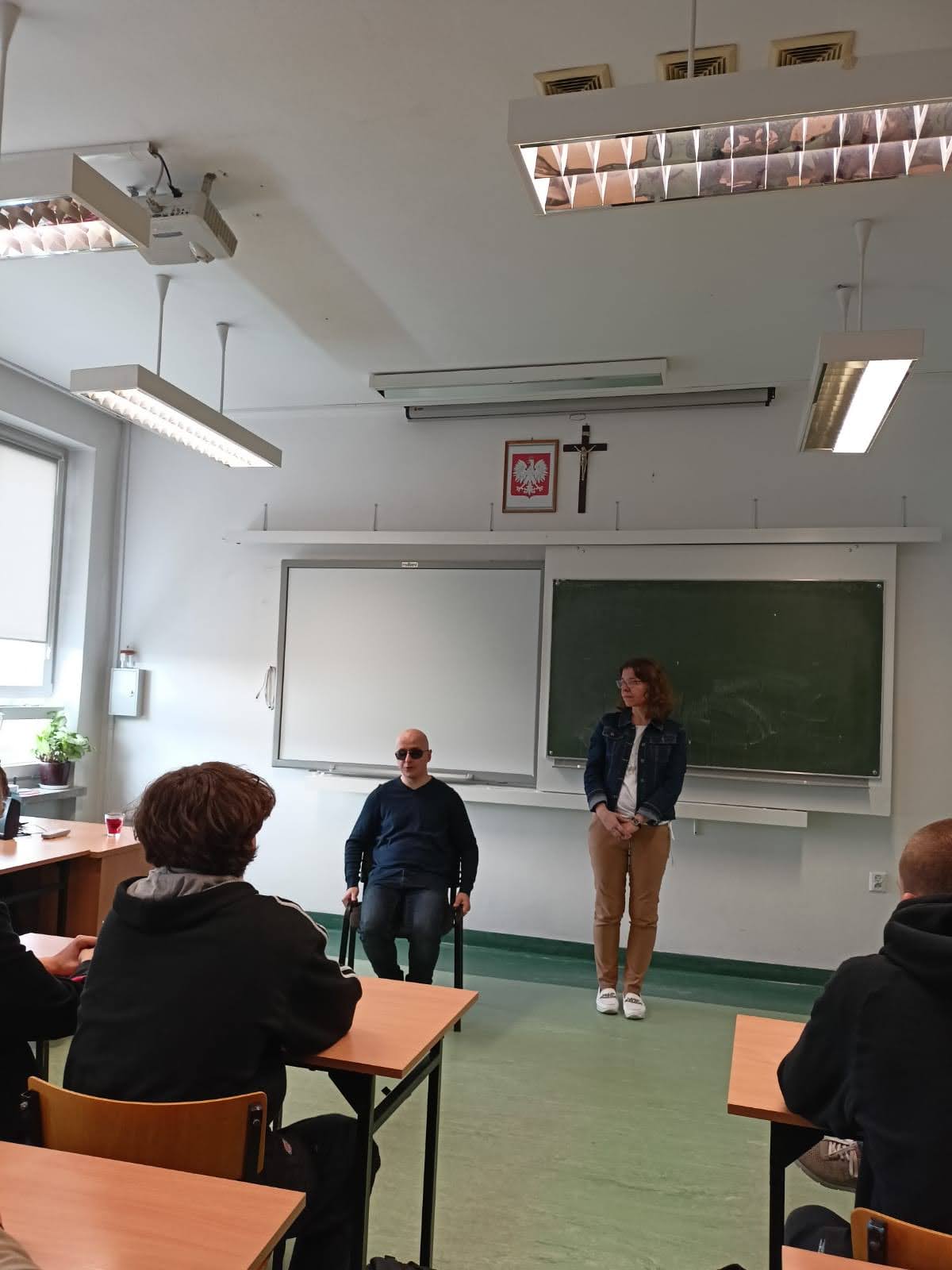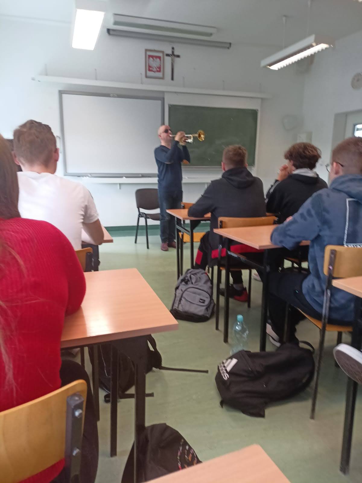 1 czerwca 2022 odwiedził naszą szkołę pan Daniel Rupiński. Spotkał się z młodzieżą, by przeprowadzić lekcję o tolerancji i porozmawiać o sytuacji ludzi niepełnosprawnych – nadsprawnych, uwrażliwić na ich potrzeby, poruszyć kwestię niedogodności, z jakimi muszą się mierzyć. Uczniowie dowiedzieli się, w jaki sposób mogą pomóc takim osobom. Pan Daniel jest osobą niewidomą. Jak sam mówi, jego życie ukształtowała wiara i miłość do drugiego człowieka, „patrzenie sercem”. Na co dzień udziela się na polu artystycznym – gra na trąbce, pianinie, akordeonie, komponuje i śpiewa. Codziennie o godzinie 12.00 można usłyszeć, jak gra na trąbce na balkonie olsztyńskiego ratusza hymn Warmii „O Warmio moja miła” do muzyki F. Nowowiejskiego. My mogliśmy posłuchać go na żywo.