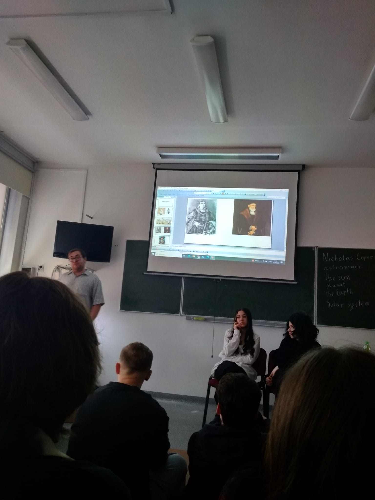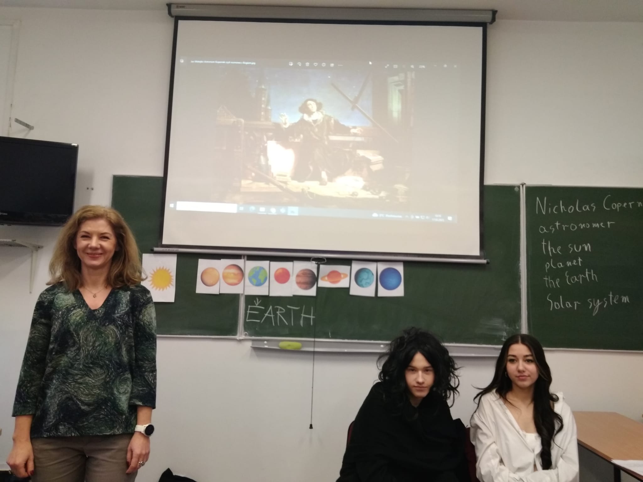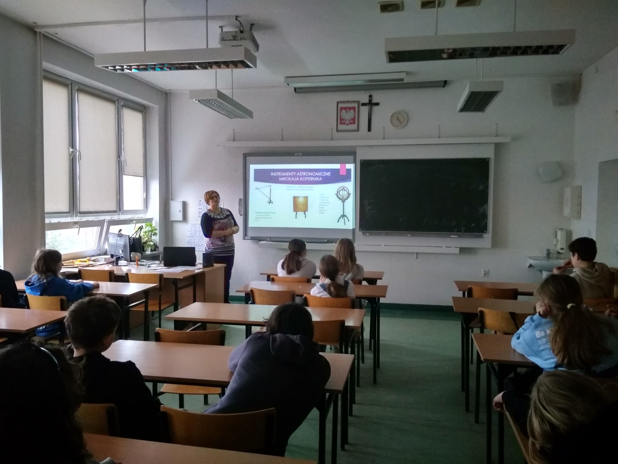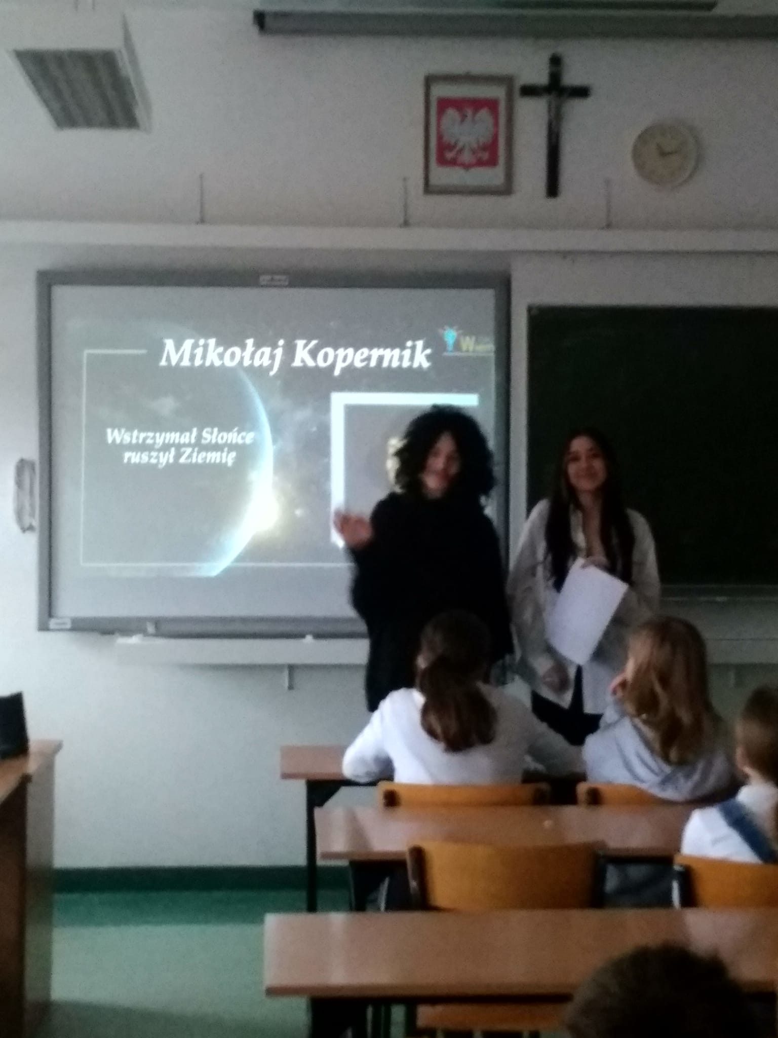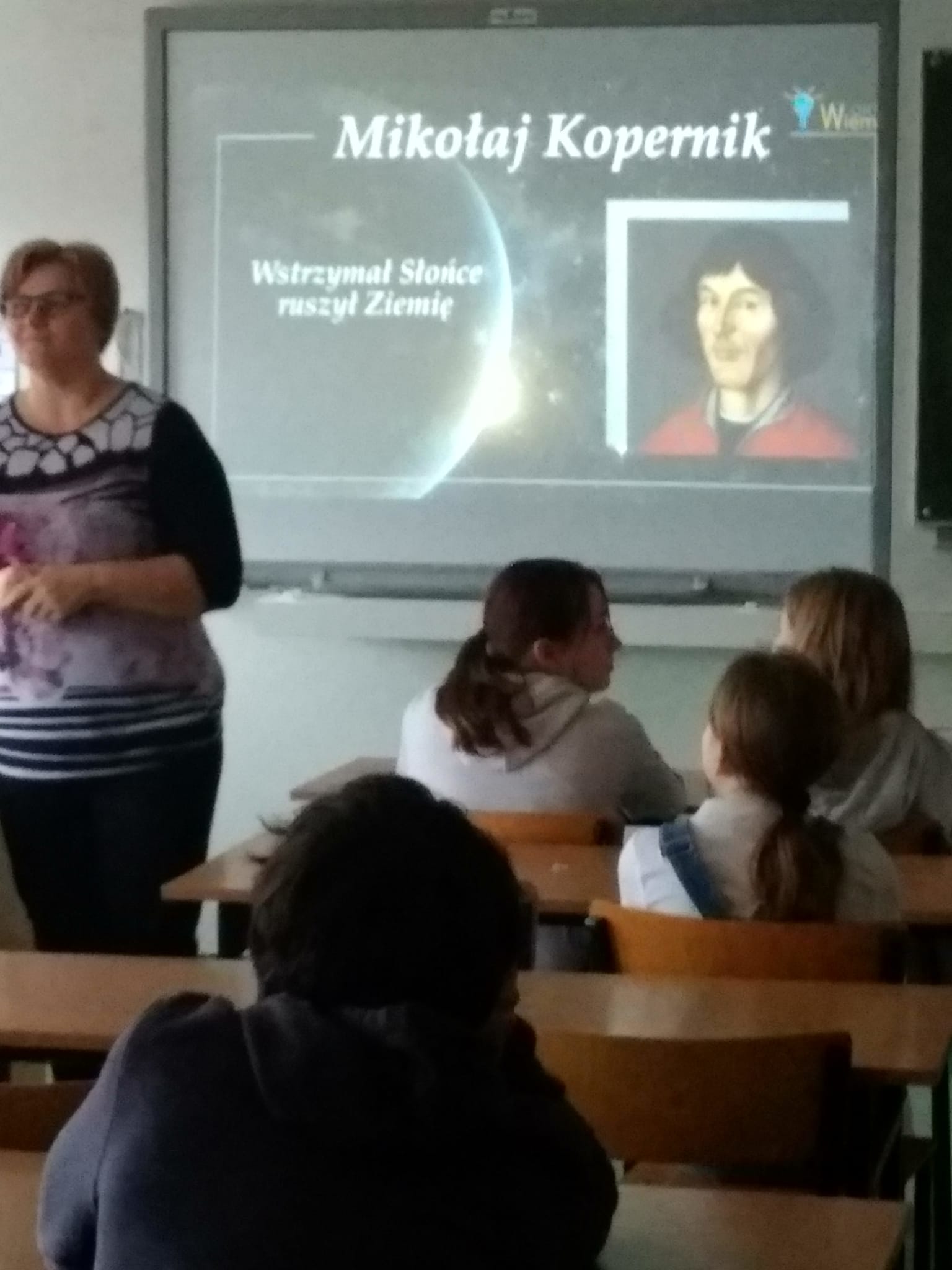 Młodzież naszej szkoły bardzo chętnie włączyła się w przygotowanie tego przedsięwzięcia, a w roli ducha Mikołaja Kopernika wystąpił Marcin Maciążek z klasy IIb. Lekcja przeprowadzona została we współpracy nauczycieli języka polskiego – p. K. Dubickiej, która zorganizowała to spotkanie, j. angielskiego – p. A. Całki, historii – p. K. Leszka oraz  fizyki – p. A. Fliggi. Szóstoklasiści uczestniczyli w wywiadzie z Mikołajem Kopernikiem, rozwiązywali quiz z j. angielskiego sprawdzający zdobytą wiedzę na temat działalności astronoma. Dowiedzieli się także o roli Krzyżaków w dobie renesansu, poznali rys filozoficzny tej epoki,  ciekawostki fizyczno-astronomiczne. Wysłuchali fragmentów książki pt. „Nazywam się… Mikołaj Kopernik” B. Kusztelskiego i B. Orlińskiego, poświęconych obronie zamku olsztyńskiego. Lekcja wzbogacona została   o omówienie obrazów „Hołd pruski” oraz „Astronom Kopernik, czyli rozmowa z Bogiem” Jana Matejki.