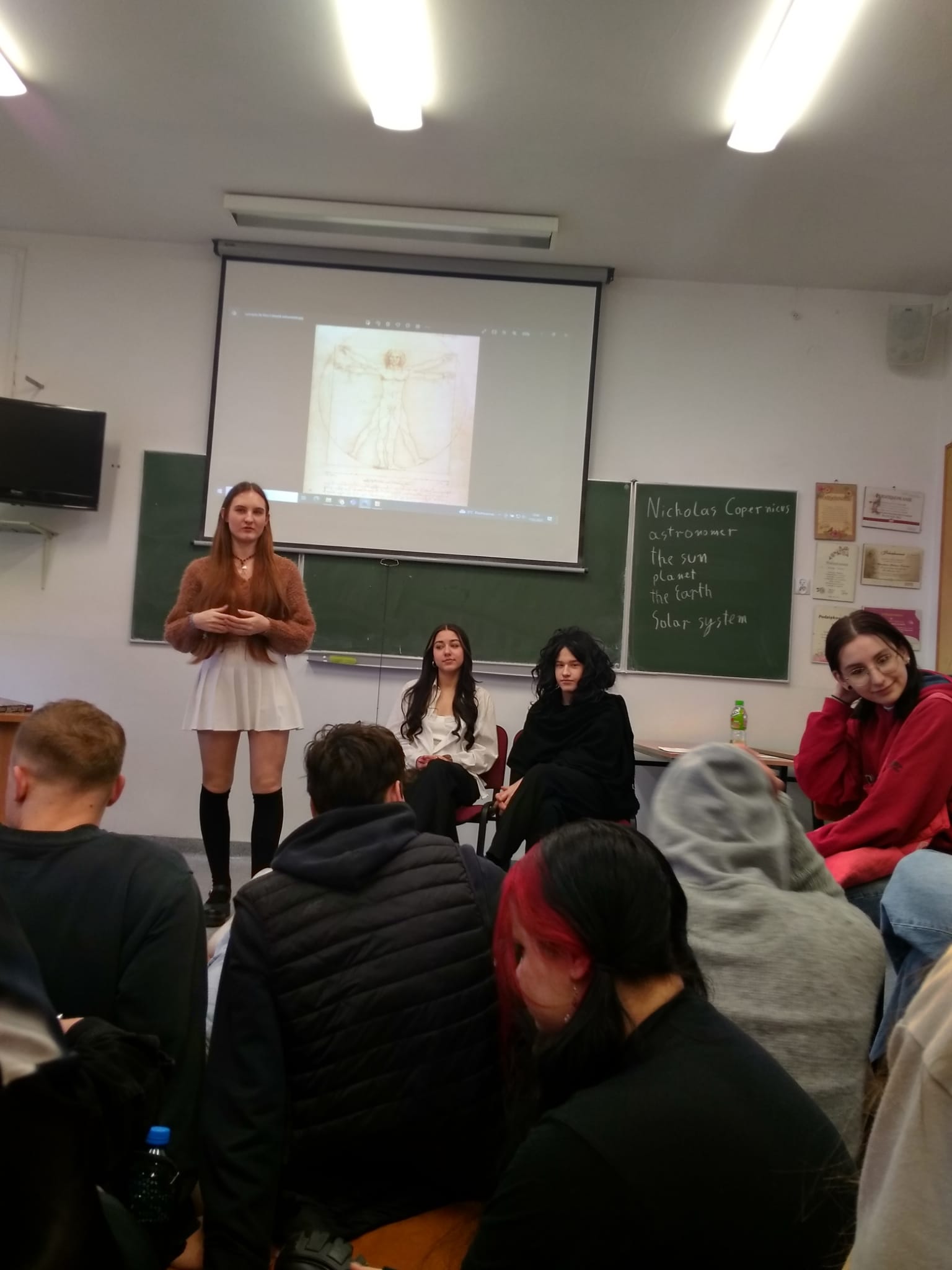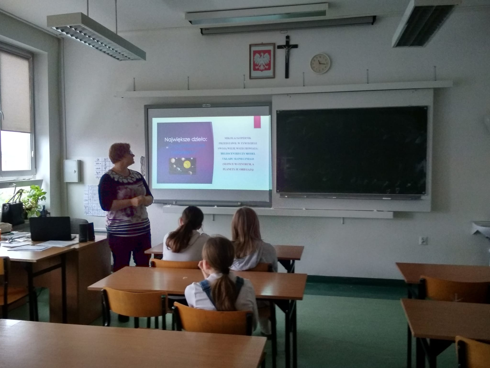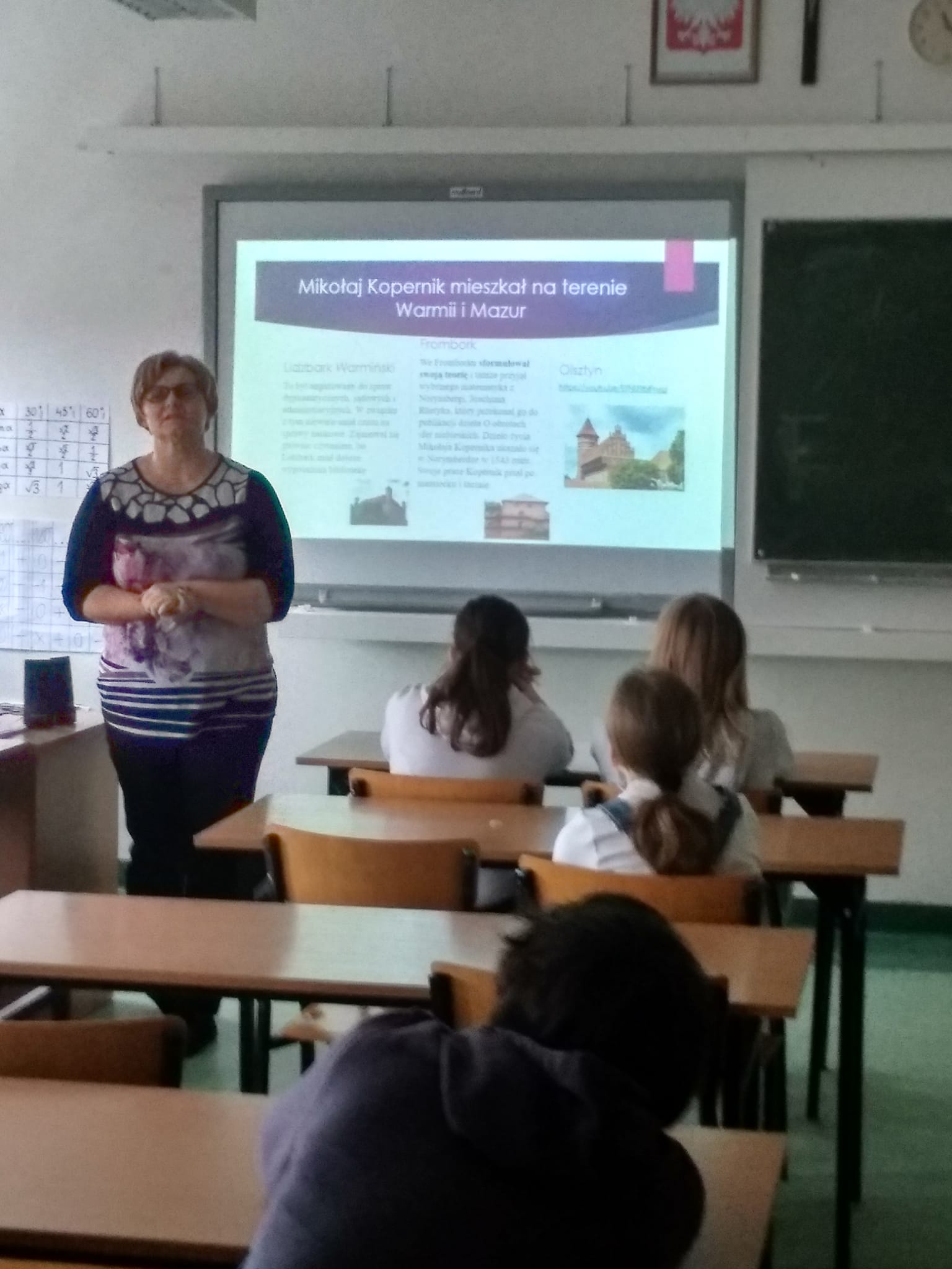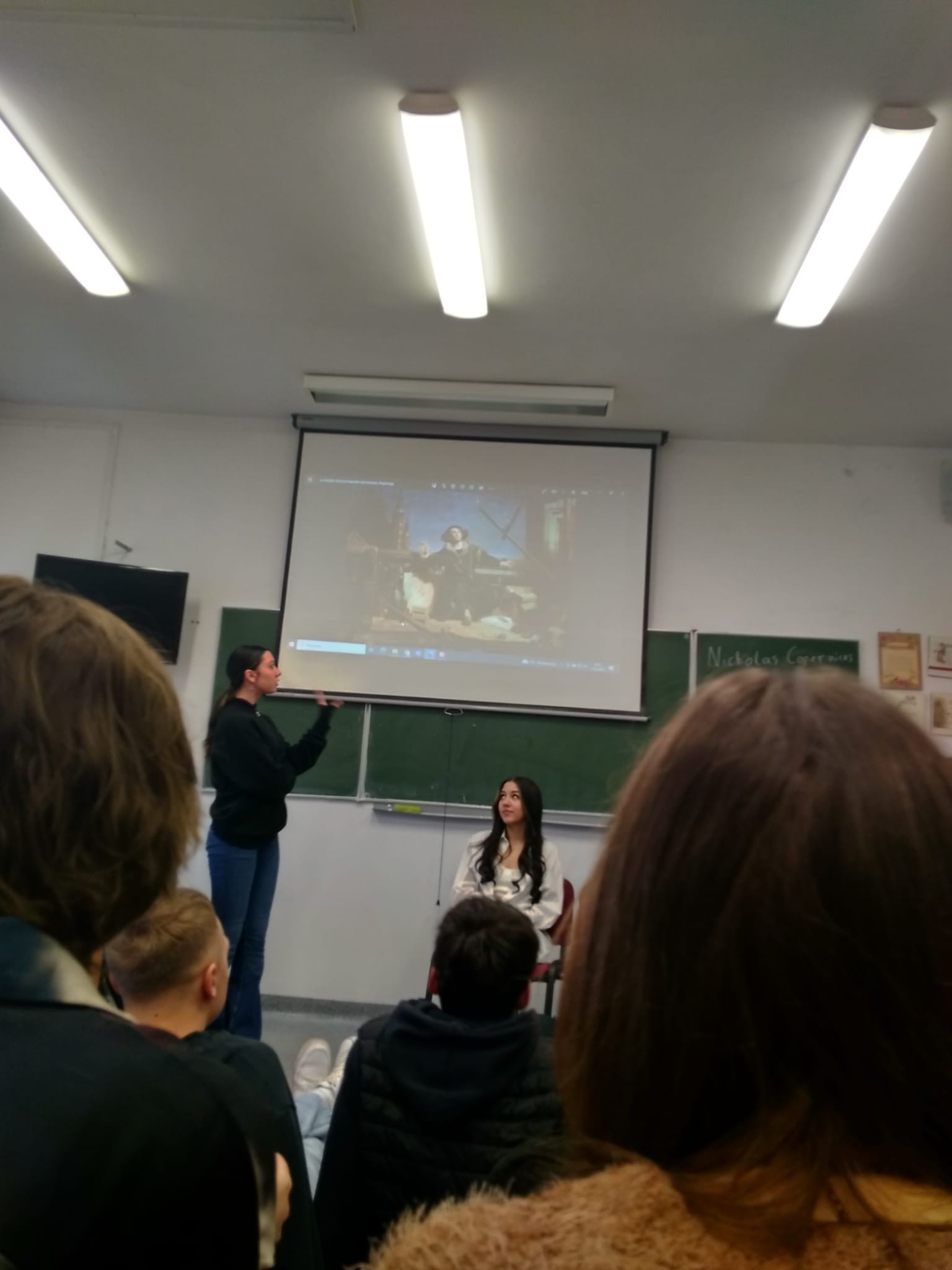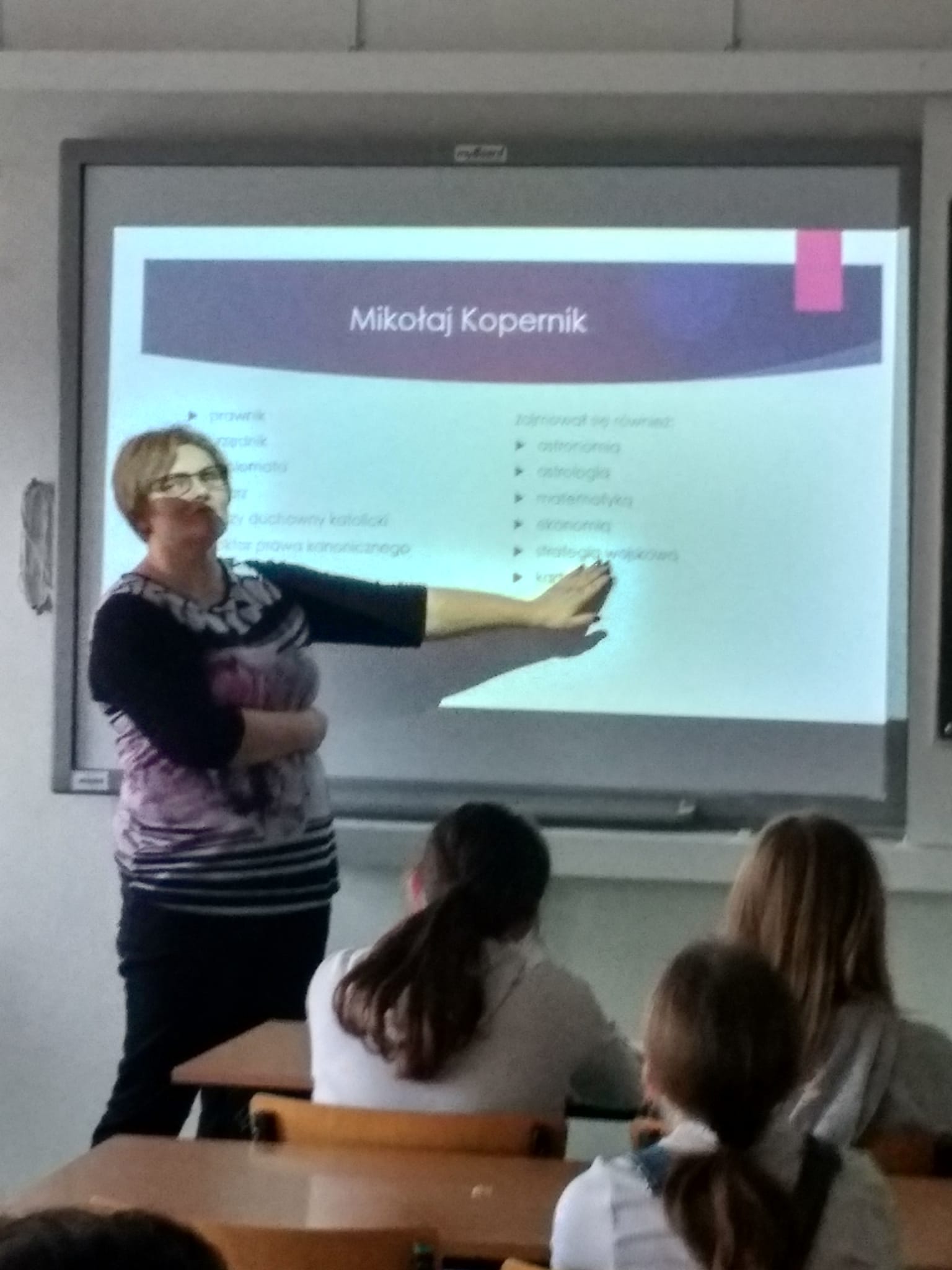 Młodzież naszej szkoły bardzo chętnie włączyła się w przygotowanie tego przedsięwzięcia, a w roli ducha Mikołaja Kopernika wystąpił Marcin Maciążek z klasy IIb. Lekcja przeprowadzona została we współpracy nauczycieli języka polskiego – p. K. Dubickiej, która zorganizowała to spotkanie, j. angielskiego – p. A. Całki, historii – p. K. Leszka oraz  fizyki – p. A. Fliggi. Szóstoklasiści uczestniczyli w wywiadzie z Mikołajem Kopernikiem, rozwiązywali quiz z j. angielskiego sprawdzający zdobytą wiedzę na temat działalności astronoma. Dowiedzieli się także o roli Krzyżaków w dobie renesansu, poznali rys filozoficzny tej epoki,  ciekawostki fizyczno-astronomiczne. Wysłuchali fragmentów książki pt. „Nazywam się… Mikołaj Kopernik” B. Kusztelskiego i B. Orlińskiego, poświęconych obronie zamku olsztyńskiego. Lekcja wzbogacona została   o omówienie obrazów „Hołd pruski” oraz „Astronom Kopernik, czyli rozmowa z Bogiem” Jana Matejki.