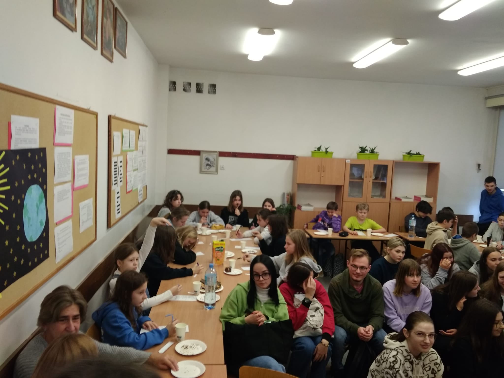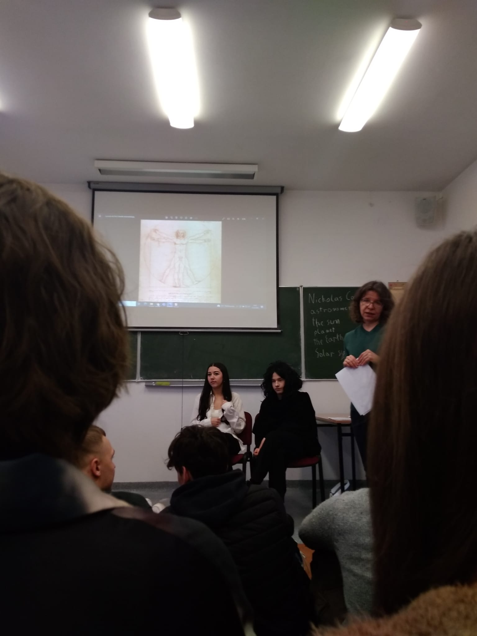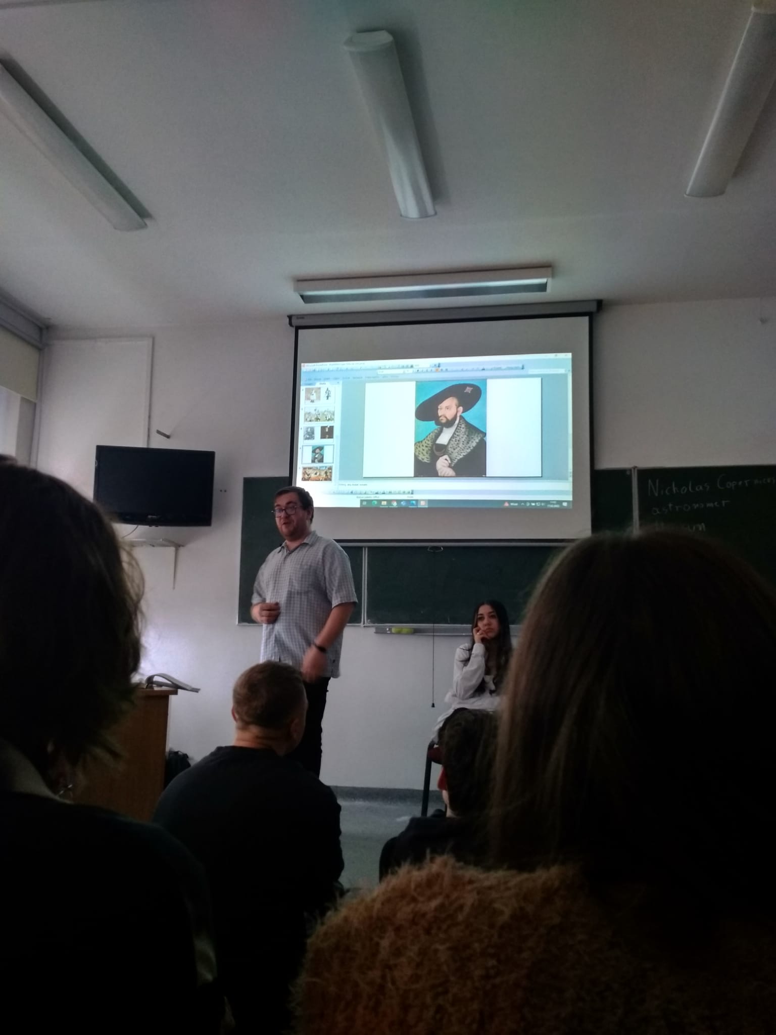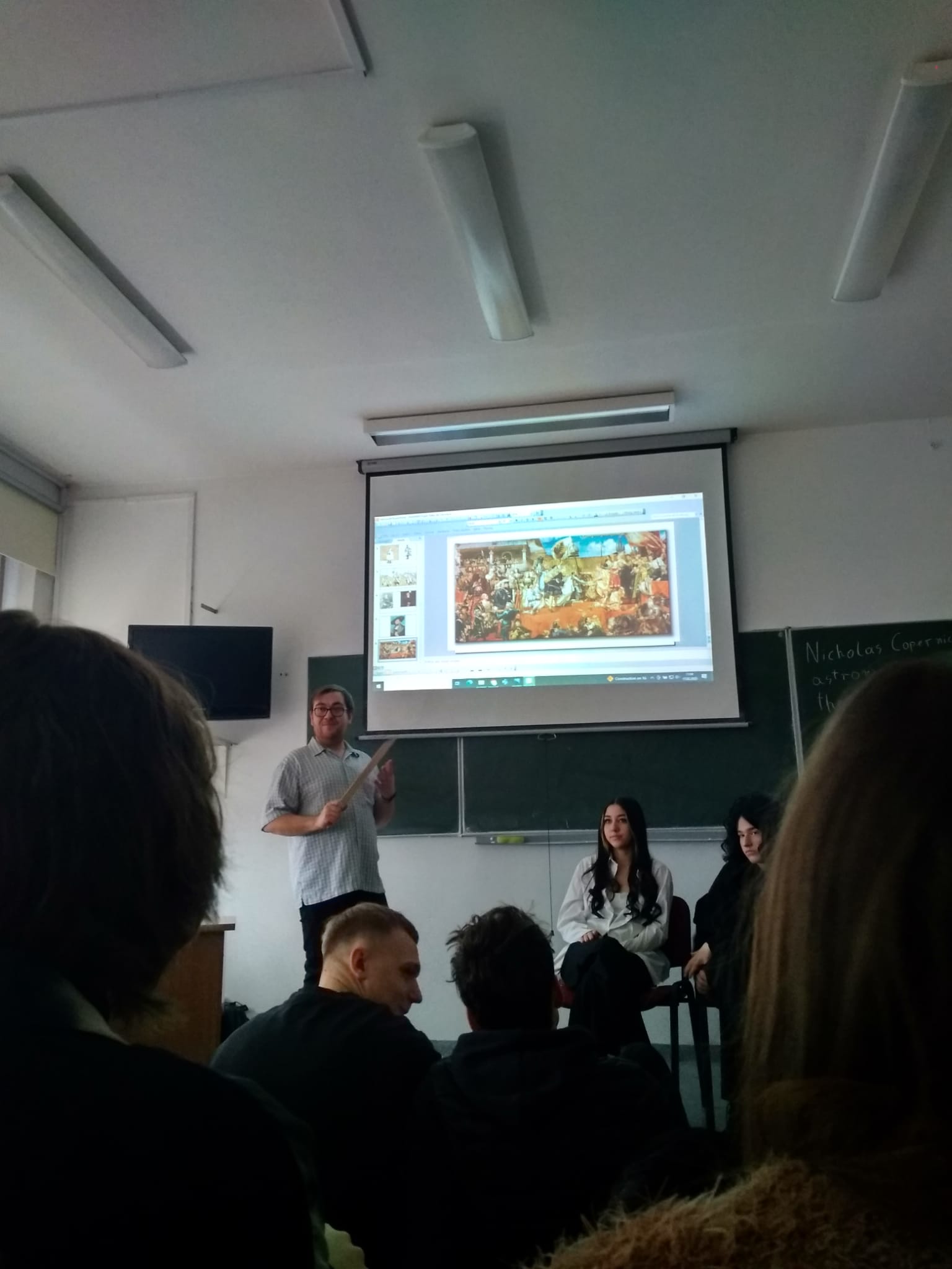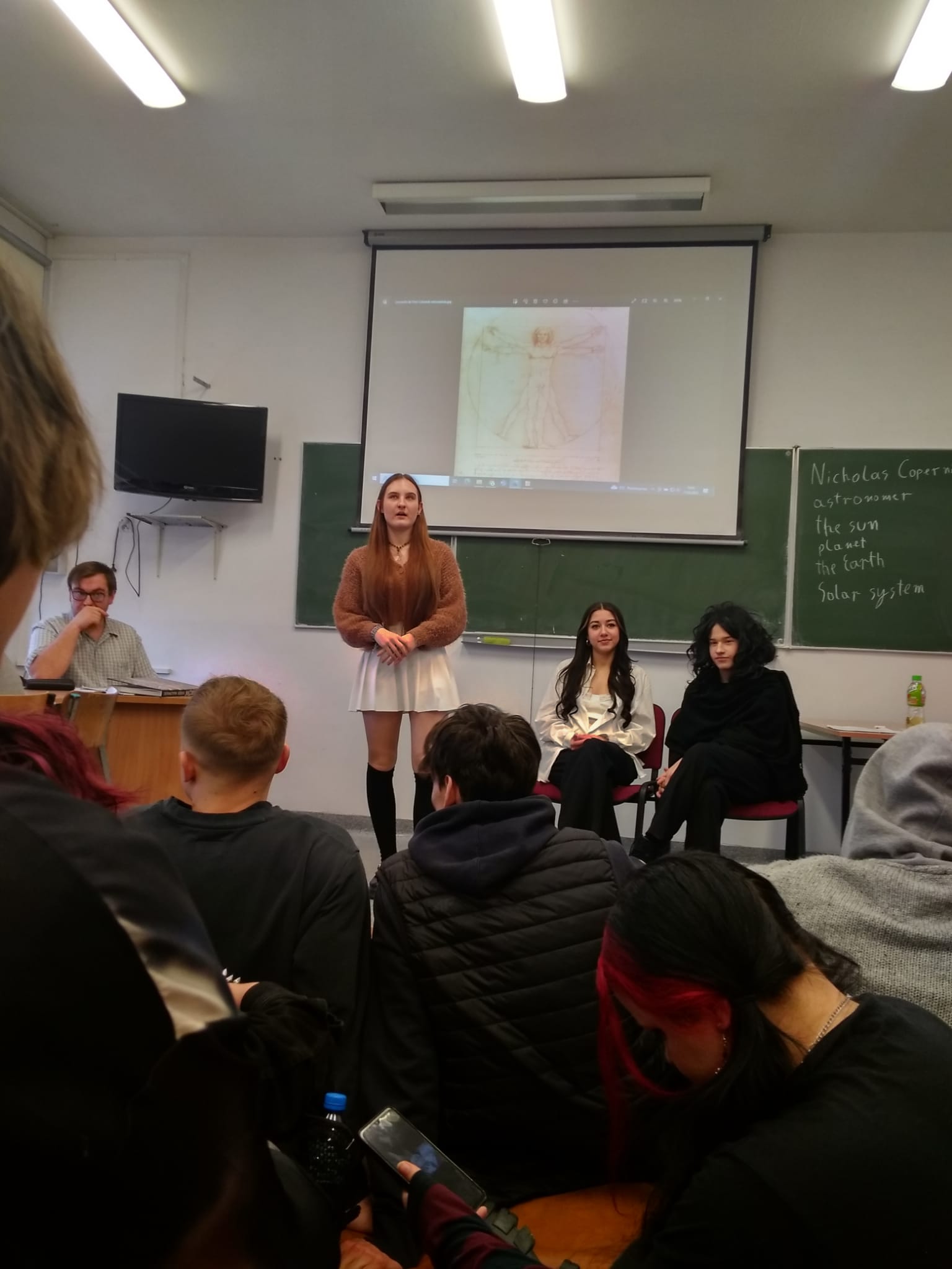 Młodzież naszej szkoły bardzo chętnie włączyła się w przygotowanie tego przedsięwzięcia, a w roli ducha Mikołaja Kopernika wystąpił Marcin Maciążek z klasy IIb. Lekcja przeprowadzona została we współpracy nauczycieli języka polskiego – p. K. Dubickiej, która zorganizowała to spotkanie, j. angielskiego – p. A. Całki, historii – p. K. Leszka oraz  fizyki – p. A. Fliggi. Szóstoklasiści uczestniczyli w wywiadzie z Mikołajem Kopernikiem, rozwiązywali quiz z j. angielskiego sprawdzający zdobytą wiedzę na temat działalności astronoma. Dowiedzieli się także o roli Krzyżaków w dobie renesansu, poznali rys filozoficzny tej epoki,  ciekawostki fizyczno-astronomiczne. Wysłuchali fragmentów książki pt. „Nazywam się… Mikołaj Kopernik” B. Kusztelskiego i B. Orlińskiego, poświęconych obronie zamku olsztyńskiego. Lekcja wzbogacona została   o omówienie obrazów „Hołd pruski” oraz „Astronom Kopernik, czyli rozmowa z Bogiem” Jana Matejki.