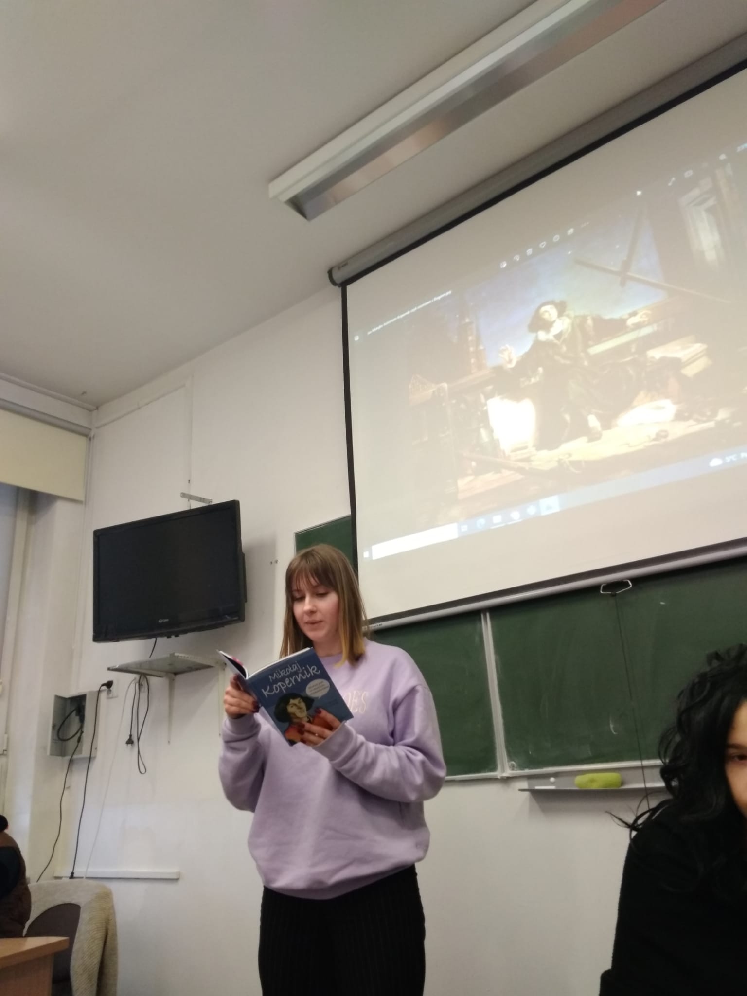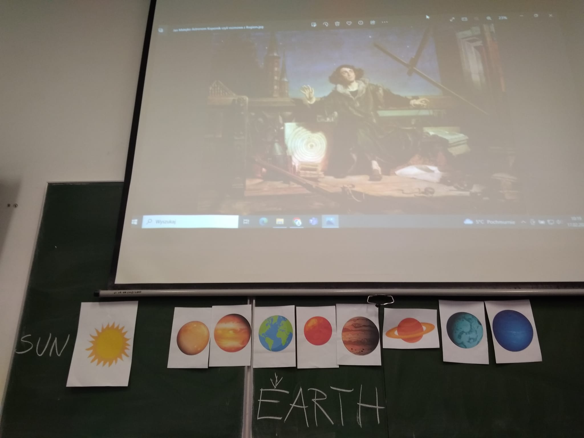 Młodzież naszej szkoły bardzo chętnie włączyła się w przygotowanie tego przedsięwzięcia, a w roli ducha Mikołaja Kopernika wystąpił Marcin Maciążek z klasy IIb. Lekcja przeprowadzona została we współpracy nauczycieli języka polskiego – p. K. Dubickiej, która zorganizowała to spotkanie, j. angielskiego – p. A. Całki, historii – p. K. Leszka oraz fizyki – p. A. Fliggi. Szóstoklasiści uczestniczyli w wywiadzie z Mikołajem Kopernikiem, rozwiązywali quiz z j. angielskiego sprawdzający zdobytą wiedzę na temat działalności astronoma. Dowiedzieli się także o roli Krzyżaków w dobie renesansu, poznali rys filozoficzny tej epoki, ciekawostki fizyczno-astronomiczne. Wysłuchali fragmentów książki pt. „Nazywam się… Mikołaj Kopernik” B. Kusztelskiego i B. Orlińskiego, poświęconych obronie zamku olsztyńskiego. Lekcja wzbogacona została o omówienie obrazów „Hołd pruski” oraz „Astronom Kopernik, czyli rozmowa z Bogiem” Jana Matejki.