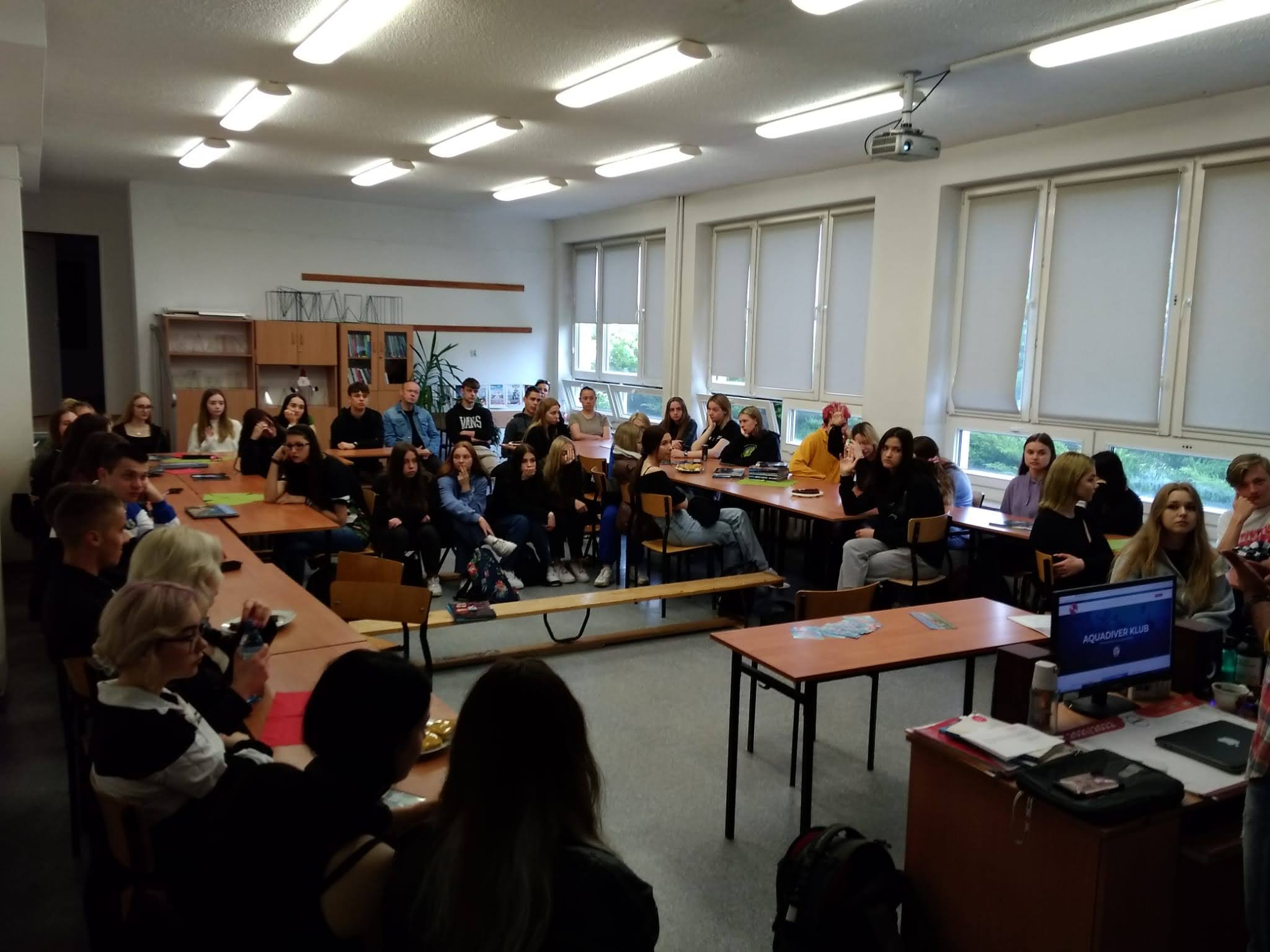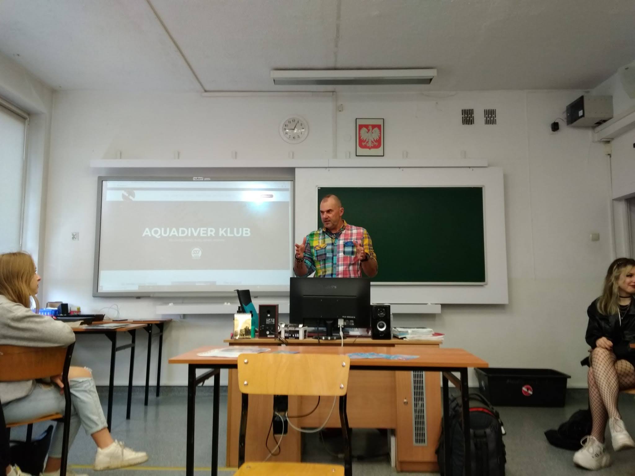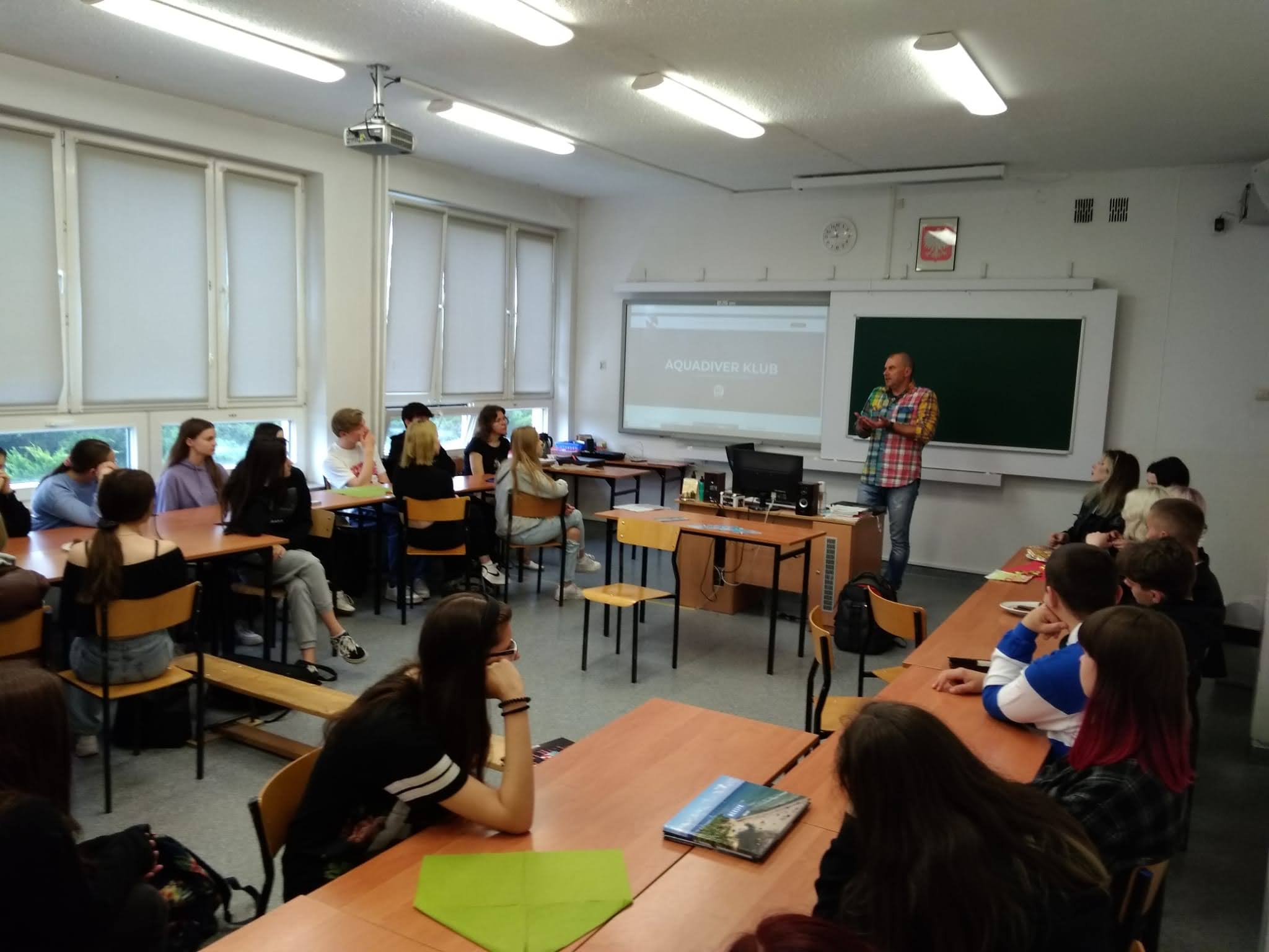 W środę 25 maja 2022 odbyło się w szkole spotkanie z inspirującym człowiekiem – panem Miłoszem Dąbrowskim. Młodzież uczestnicząca w spotkaniu mogła usłyszeć o jego licznych zainteresowaniach i pracy m.in. w olsztyńskiej Stacji Krwiodawstwa. Pan Miłosz jest płetwonurkiem, pracuje w firmie Aquadiver, jest także instruktorem lotnictwa (Aquafly). Prowadzi bardzo aktywne i bogate w przygody życie. Rozmowa z nim zainspirowała młodych ludzi do podejmowania działań i stawiania przed sobą wyzwań. Uświadomiła, że warto dążyć do celów, nawet gdy na drodze do ich realizacji pojawiają się przeszkody.