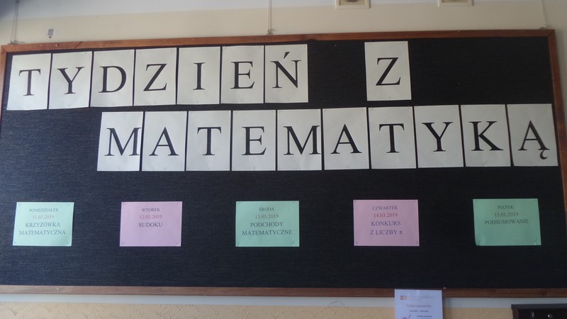 W dniu 11 marca 2019 ruszył w naszej szkole “Tydzień z matematyką”. W ramach imprezy zaplanowano wiele rozrywek między innymi krzyżówkę matematyczną, sudoku, podchody matematyczne, konkurs z liczby π.